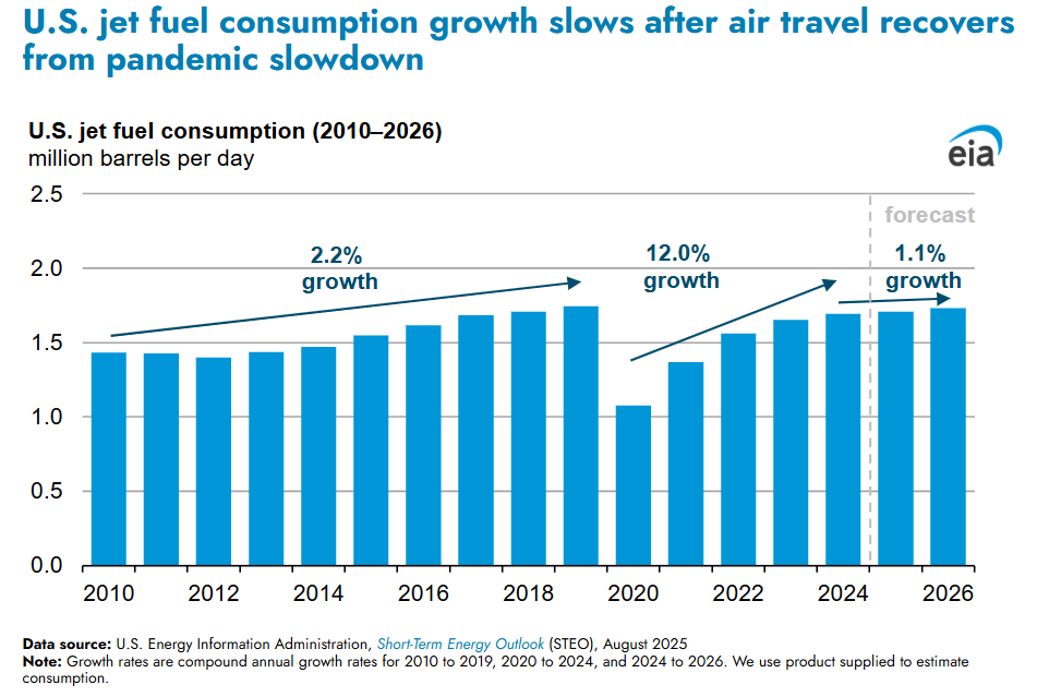 U.S. jet fuel consumption growth has slowed in 2025, following a period of rapid consumption growth after 2020, as U.S. air travel recovered from the COVID-19 pandemic. The U.S. Energy Information Administration (EIA) forecasts the slowdown in jet fuel consumption growth will continue through 2026, falling below both the accelerated rate of the previous four years and the longer-term growth rate seen during the 2010s. Contributing factors include rising economic concerns weighing on flight demand and ongoing improvements in commercial aircraft fleet fuel economy.