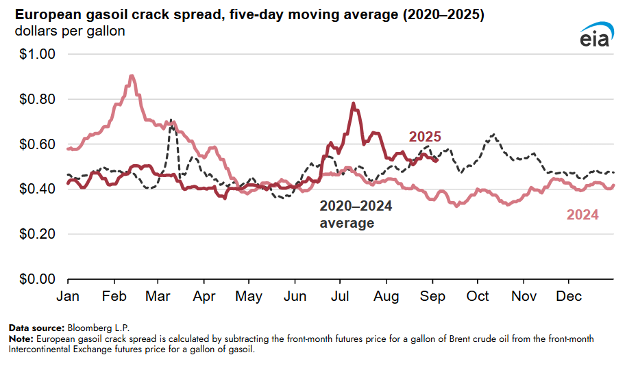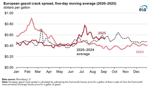 The Intercontinental Exchange (ICE) gasoil crack spread calculated against Brent crude oil is one indicator of the relative value of gasoil in major European markets. The monthly average ICE gasoil crack spread increased $0.09 per gallon (gal), or 22%, in June and then an additional $0.15/gal, or 29%, in July. The crack spread reached its highest point of the year at $0.84/gal on July 10, before beginning to decrease. By mid-August, supply disruptions appeared to have been largely resolved, and the crack spread aligned with the 2020–2024 average.