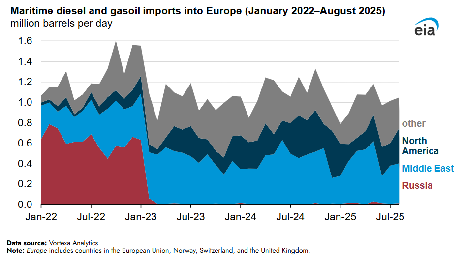 In early 2023, the European Union implemented a ban on seaborne imports of diesel fuel, commonly called gasoil, from Russia following Russia’s full-scale invasion of Ukraine the previous year. The ban reoriented trade flows as Europe imported more diesel from the Middle East and the U.S. rather than Russia. This summer, Europe’s increased reliance on imports from the Middle East, coupled with conflict-related disruptions to refineries and escalating geopolitical tensions, contributed to a tightened global diesel market.