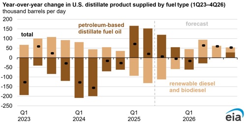 U.S. refinery closures also play a role in the forecast low distillate inventories through 2026. The LyondellBasell Houston refinery shut down in early 2025; another two refineries in California with a combined 284,000 b/d in refining capacity plan to close over the next two years. The loss of refining capacity will likely reduce U.S. production of petroleum products, including distillate fuel oil, reducing the output available to restock distillate inventories. We expect increased renewable diesel production in 2026 will partially offset some of the decline in distillate fuel oil production.