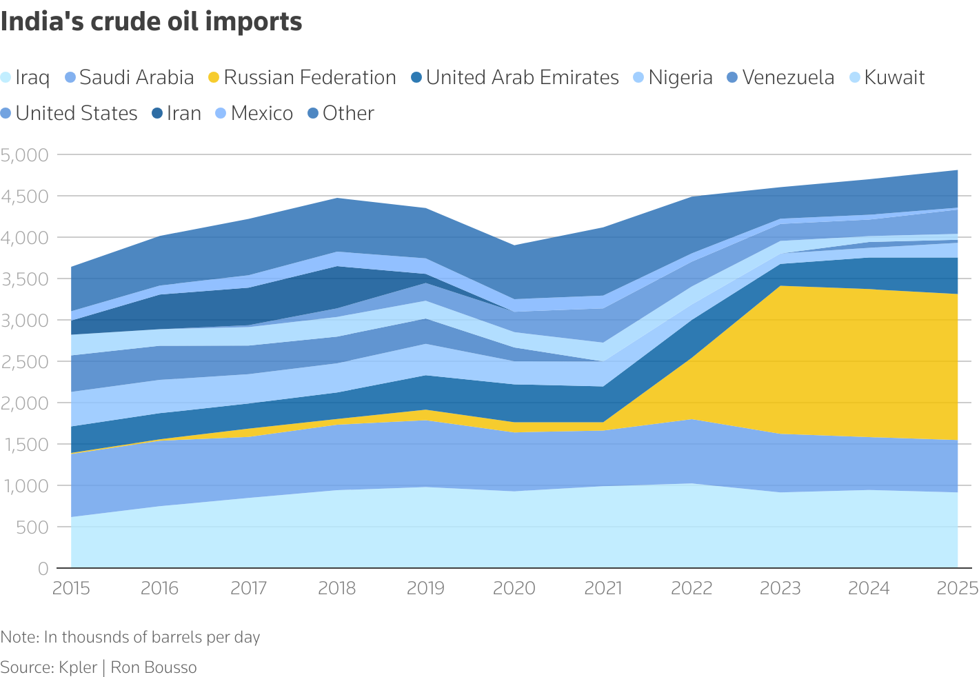 India has become a major trade buyer of Russian oil since Moscow’s invasion of Ukraine in 2022. It purchased 1.9 MMbpd of Russia’s crude in the first nine months of 2025, 40% of its total exports, according to the International Energy Agency.