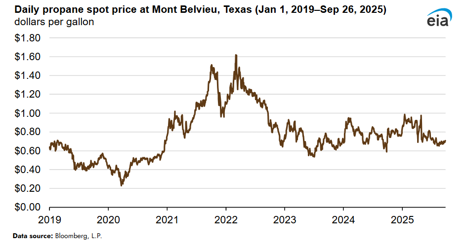 Inventories grew quickly earlier this year because of growing domestic propane production, particularly in the Gulf Coast region. This production growth outpaced international demand for U.S. propane exports, which have increased slightly throughout 2025, despite changes in tariffs that affected propane export volumes earlier in the year.
