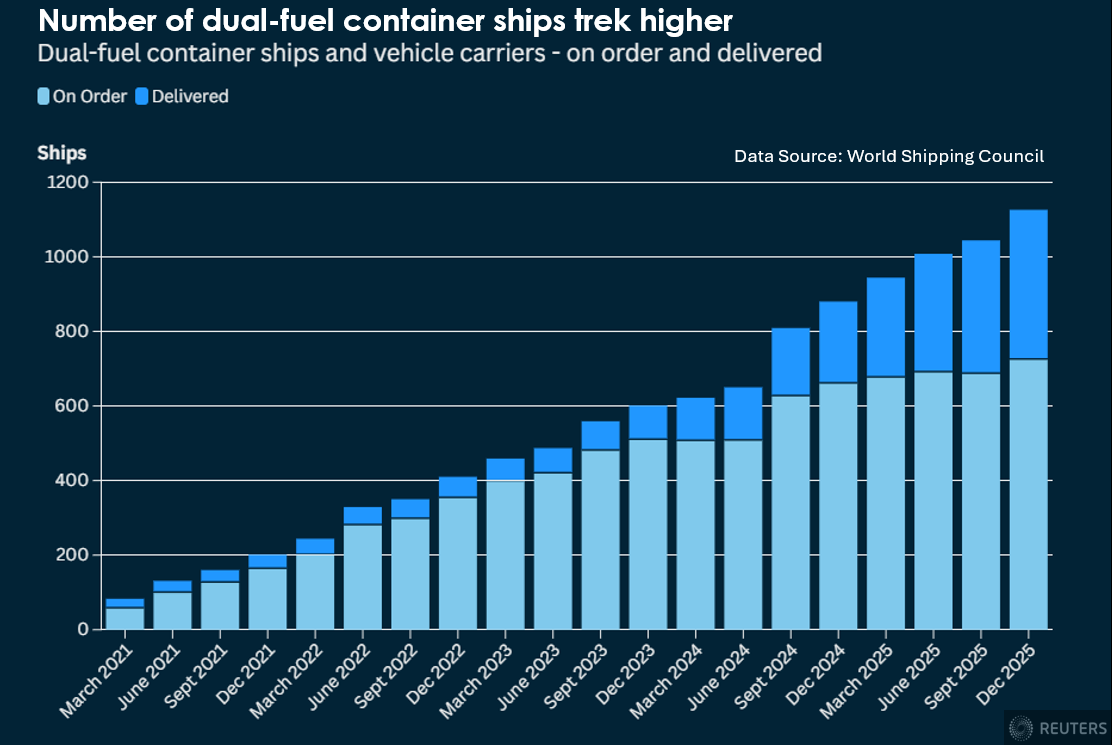 By the end of December, companies had invested > $150 B in dual-fuel vessels, according to an analysis of data from the World Shipping Council, an industry group for container shipping and vehicle carriers.