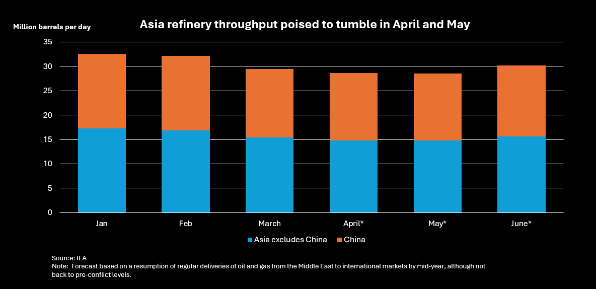 Asian refining throughput is set to tumble in April and May as crude imports hit a 10-year low and the Iran war forces refiners to process lighter grades, curbing diesel and jet fuel output by at least 1 MMbpd, analysts and refining sources said.