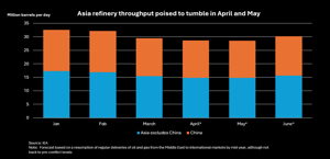 Consultancy Energy Aspects forecasts crude processing will fall to 28.4 MMbpd in April and 28.7 MMbpd in May, from 30.4 MMbpd in March.