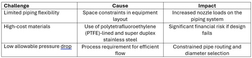Key constraints included fitting large-bore piping into a compact brownfield area (approximately 40 m × 12 m), managing standard ISO pump nozzle loads, and designing piping systems (sizes 44"–24") with super duplex stainless steel and PTFE-lined carbon steel. Early stress analysis identified 20 critical locations for expansion joints, but available vendor catalogues lacked technical data for these large sizes.