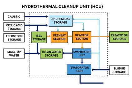 HCU: Process description. The HCU processes feedstock through hydrothermal treatment, facilitating phase separation into oil, water and sludge. Additives—including caustic and citric acid—are introduced to optimize reactions inside the reactor section. FIG. 1 depicts the detailed block flow diagram of a typical HCU process. Following separation, treated oil and recycled water are managed through dedicated systems, while sludge byproducts undergo safe storage or further treatment. The system employs chemical storage and clean-in-place modules to enhance reliability and minimize downtime.
